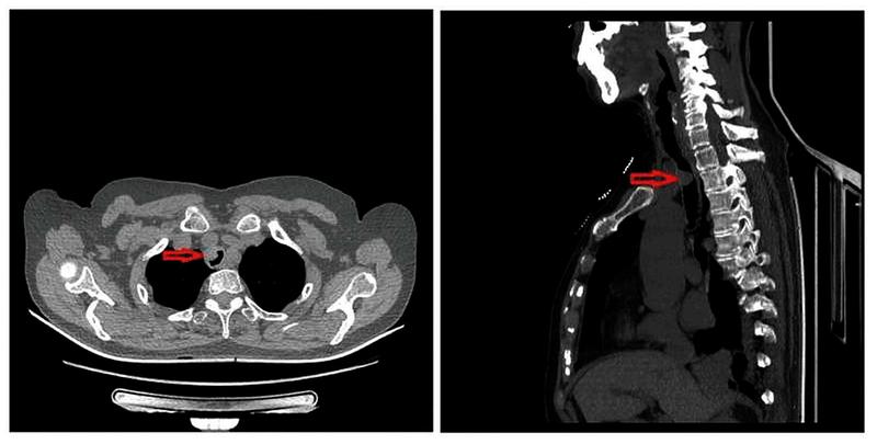 71岁的女性患者王某,因“胸闷气短1月余”于2020年08月31日入住我院胸外科。胸部CT及支气管三维重建提示主气道肿物(图1),气管镜检查提示距声门6cm、隆突上5cm处隆起性病变,位于胸锁关节后方,占据管腔60%,取病理活检提示“粘膜腺样囊性癌”(图2)。经过术前检查排除手术禁忌后李少民主任邀请急诊科、麻醉科等相关科室进行多学科会诊,遂决定行在ECMO配合喉罩通气下行气管肿瘤切除、气管吻合术。9月9日上午,患者进行全身麻醉后,急诊科团队立即进行VV-ECMO连接,确保患者术中血氧的维持,随后胸外科李少民主任、马跃峰副主任医师团队进行手术操作,术中见肿瘤位于右头臂干及左颈总动脉后方,牵开双侧动脉充分游离并显露气管肿瘤位置,完整切除了肿瘤位置的气管,共切除4个气管环,长度约3cm(图3),并成功完成主气管上下残端吻合(见图4),手术过程顺利,术后患者生命体征平稳,顺利脱离ECMO、去除喉罩后安全返回胸外科监护室,目前患者病情稳定。