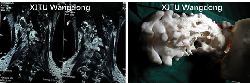 本报讯 近日,骨二科(脊柱外科)联合神经外科完成了一台多次手术后复发风险较大的神经纤维瘤切除术+颈椎后路固定植骨融合术。患者,男性,27岁,不久前因右侧肢体无力就诊于我院骨二科(脊柱外科),住院诊断为颈椎神经纤维瘤术后复发,颈椎畸形。影像学检查可见颈3-5椎体右侧及后方大体积肿瘤(3.3x2.8x3.1cm);肿瘤压迫颈段脊髓(C4)导致相应节段脊髓变性。同时瘤体包绕右侧椎动脉,手术中稍有不慎就可能损伤脊髓及椎动脉导致不可挽回的后果。同时,患者前后经历多达3次手术,加上肿瘤的破坏,正常的颈椎解剖结构消失,更增加了手术难度。王栋教授及其团队认真分析病人病情,并请多个科室的专家进行多学科联合会诊。经过术前精心准备,在充分讨论手术中可能遇见的各种意外情况及解决方案后实施手术。由脊柱外科王栋教授、神经外科吕健教授主刀,在脊柱外科、神经外科、麻醉科,手术室护士等多科室的协作下,经气管插管全麻下顺利完成此次手术。术中显示肿瘤质地硬韧,与周围瘢痕组织混杂在一起,压迫脊髓同时与硬膜粘连。术中仔细分离切除压迫脊髓的肿瘤,并在3D打印模型的辅助下重建了脊柱稳定性。目前,患者正在康复中,生命体征平稳,四肢肌力正常。
