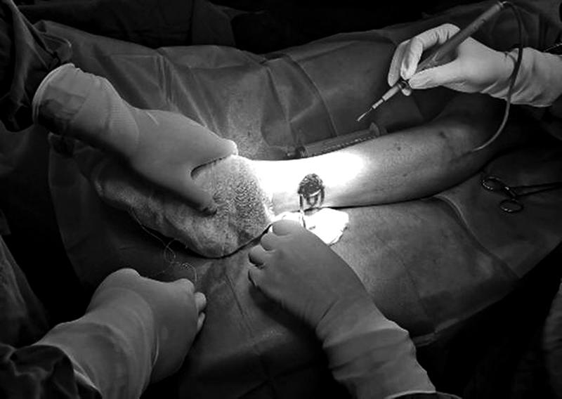 黎跃华主治医师接诊患者后,仔细询问了病情,制定了手术计划。术前根据患者的身体情况积极控制血糖、疏通微循环、创面抗感染、加强营养支持等。经术前讨论,通过硬膜外麻醉,黎跃华主治医师从患者左大腿用滚轴刀取薄中厚皮片,移植到左小腿创面,取皮区的真皮生发层完好无损,5天后就有表皮层长出。一周后移植皮片完全存活,供皮区愈合良好,彻底治好了困扰患者两个多月创面久不愈合的难题,解决了患者及家属的大苦恼。患者术后第10天即可正常步行回家工作生活。
