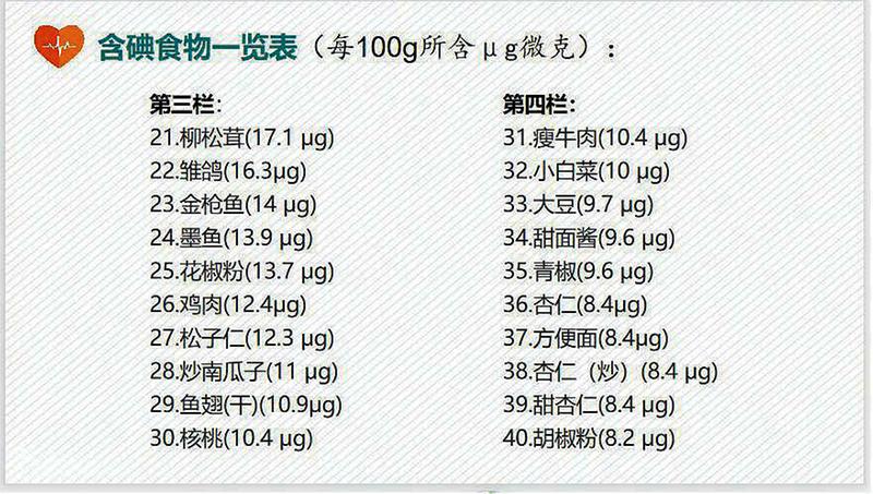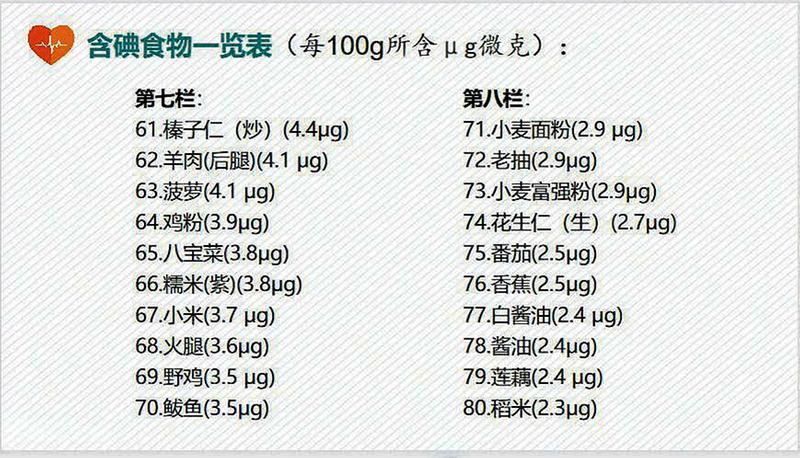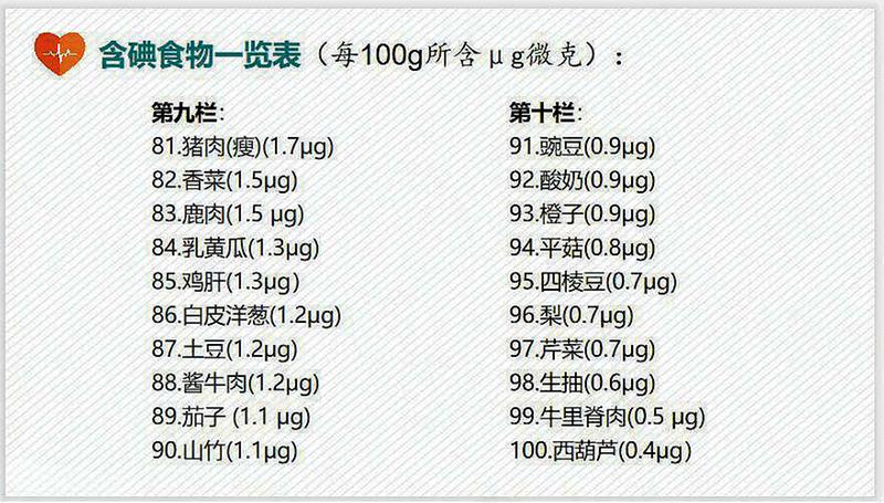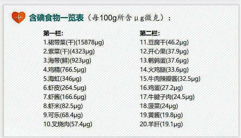 四、补碘饮食:简而言之,就是根据需要在食物中补充含碘量较高的食物。食物具体含碘的多少在后面的附录中注明,大家可以移步查看。