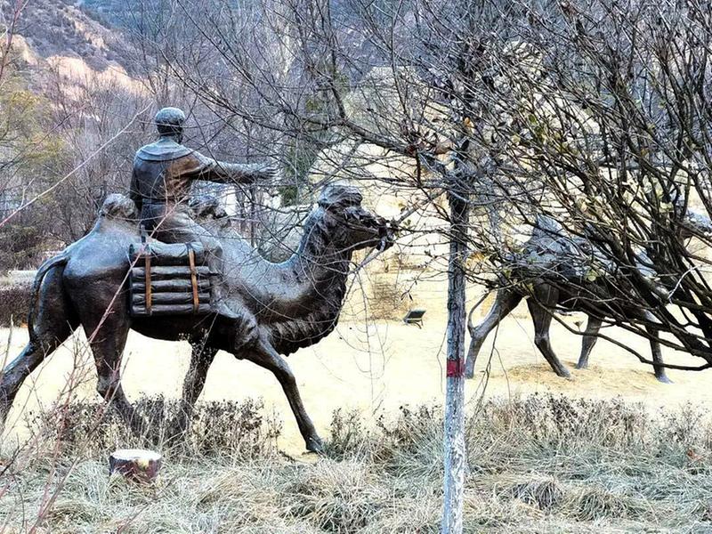 廊桥的左侧是当地修建的“丝路风情园”,园区不大,园区有骑骆驼的波斯貌相的商人,还有张骞的石雕像,陕西汉中人张骞尽“住”在千里之外的镇原县亭口。