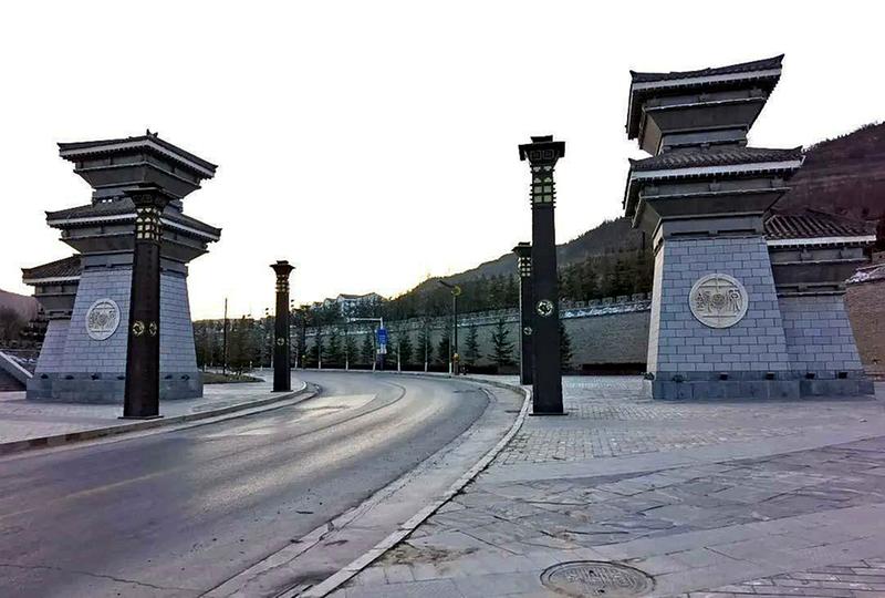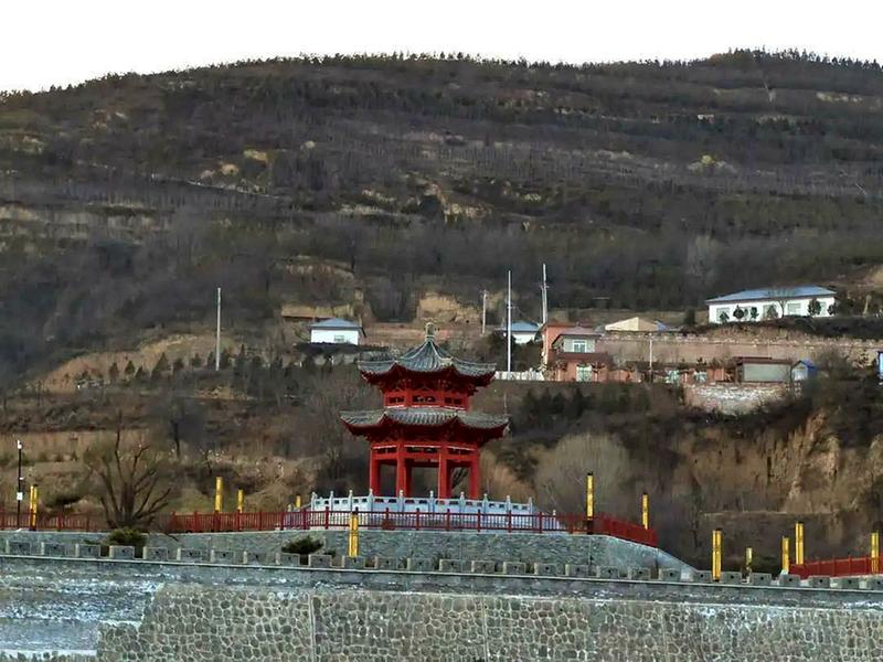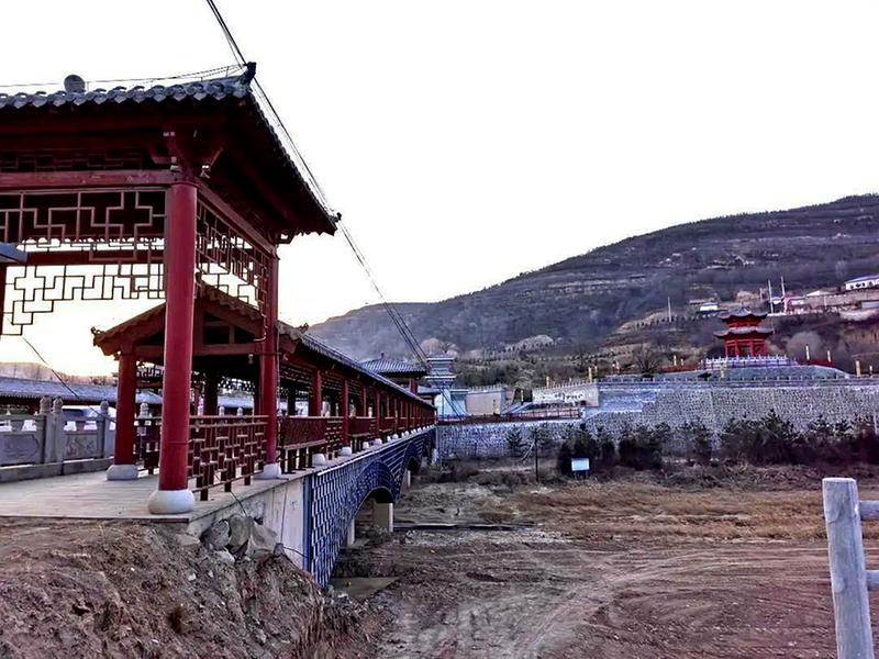 廊桥向西延伸,河对岸是双向柏油马路,通向镇原县城,入境镇原的“大门”刻有“镇原”二字,建筑有秦汉风格,庄严肃穆,我偏好秦汉建筑风格。据说有秦朝时期的车辙,我没有发现。过了廊桥,河对岸就是镇原县境了。在镇原县境内,廊桥的右侧是一座朱红色纪念亭;