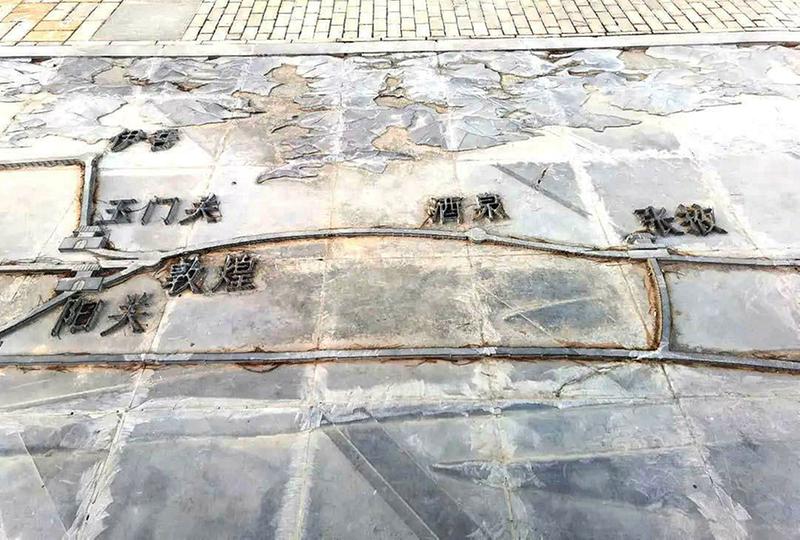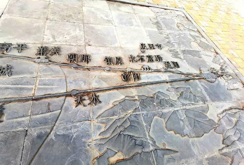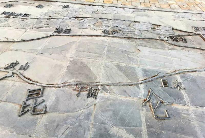 在丝路风情园内,我惊喜地发现,园区地上有石雕丝路地图。在我的历史藏书中,没有找到敦煌以西即“西出阳关”后的地图。啊,真是“踏破铁鞋无觅处”,原来古“丝绸之路”的地图就静静地躺在这小山沟!名副其实的“在地上的图”!忙用手机分段拍照下刻在地上的地图。