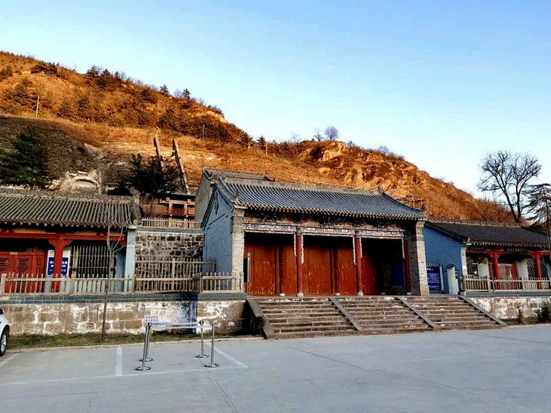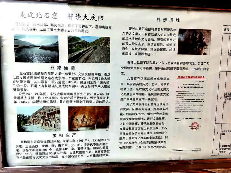 在廊桥的庆阳地界桥头旁边,是公元509年北魏时期开凿的石窟博物馆,已经关门。在大门外拍了几张照片,文字介绍让我知晓了石窟名为北石窟,以及桥下河流和山的名称。
