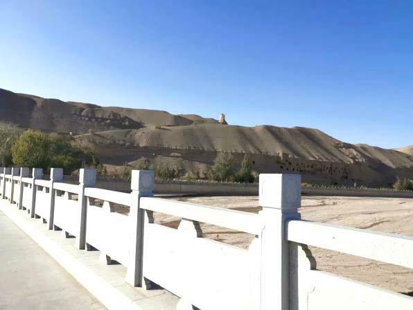 (莫高窟的洞在沙漠中,洞窟前是条小河。)