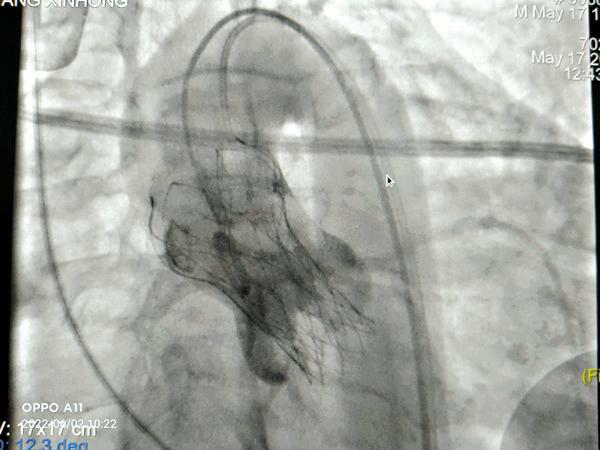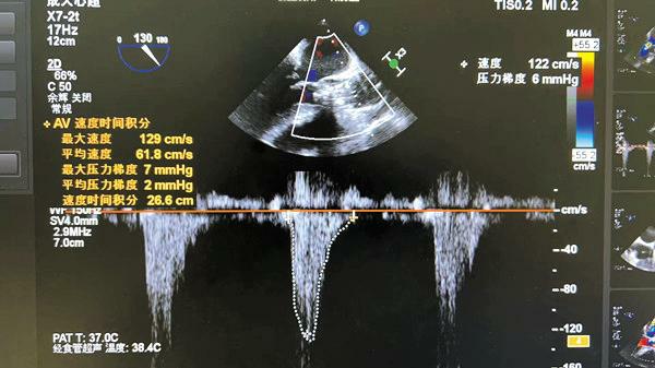 在我院心外科裴斐主任医师,麻醉科刘鹏斌主任医师、罗斌主治医师,超声科韩东刚副主任医师、金鑫主治医师,曹春晖护士长领导的护理团队等多学科协助下,韩振华主任、王新宏副主任医师、刘小军主治医师等先为患者行冠脉造影提示右冠近段95%狭窄(图1),先行PCI干预,右冠植入3.0x22mm支架1枚(图2)。后成功为患者植入TAV24mmVitaFlow瓣膜系统,DSA造影显示主动脉瓣位置良好,未见明显瓣周漏(图3),左右冠脉造影正常,术后即刻心脏超声示最大跨瓣流速129cm/s,最大跨瓣压差7mmHg(图4),顺利结束手术。