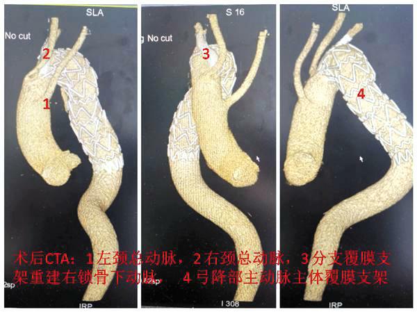 术后三天,张先生的上肢及颜面肿胀症状明显得到改善。复查CTA显示支架形态良好,主动脉已经恢复正常形态,Kommerell憩室消失,定时炸弹般的动脉瘤腔已经血栓化,破裂的风险彻底解除,周围受压的组织结构逐渐恢复。端午节前张先生顺利出院。