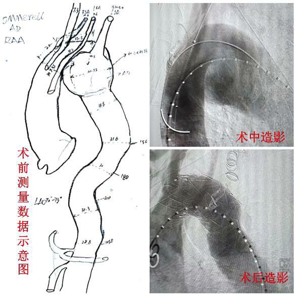 鉴于张先生的病变复杂,病情严峻,心血管外科裴斐主任同患者家属多次沟通交流,考虑到患者主动脉手术解剖难度极大,本身合并高血压及慢阻肺等基础疾病,如果行常规的全麻体外循环支持下深低温主动脉弓手术风险显著升高。最终决定选择手术风险相对低但技术挑战性更强的腔内血管介入手术治疗。术前准备工作不仅需要准确测量从升主动脉起始段到正常降主动脉包括各个主要分支血管的起源、走形、直径以及间距等诸多数据,而且还要对脑循环血供准确评估。特别是由于病变的迷走左锁骨下动脉需要处理。相里伟医生专门联系有丰富脑血管介入经验的神经内科王虎清医生共同讨论,对于可能的脑缺血风险进行了谨慎评估和妥善准备。经过多方努力,一个设计合理准备充足尽可能降低手术风险的方案最终确定。
