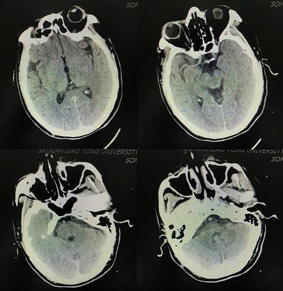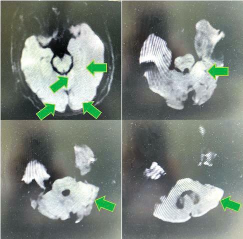 颅脑DWI示左侧小脑半球、左侧颞叶、双侧枕叶急性脑梗死