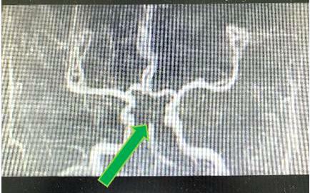 颅脑MRA示双侧大脑后动脉及双侧小脑上动脉未见显影,基底动脉远端闭塞