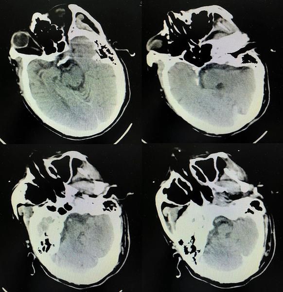 此时,患者的意识状态进一步恶化,呼之不应,肢体瘫痪,间断呕吐胃内容物,双侧眼球部分凝视,双侧瞳孔不等大,左侧瞳孔6mm,右侧2.5mm,对光反射均迟钝,神经系统NIHSS评分已经达到20分(NIHSS评分>15分为中重度卒中,分数越高提示神经受损越严重)。