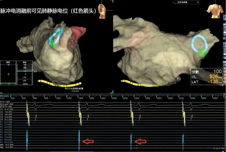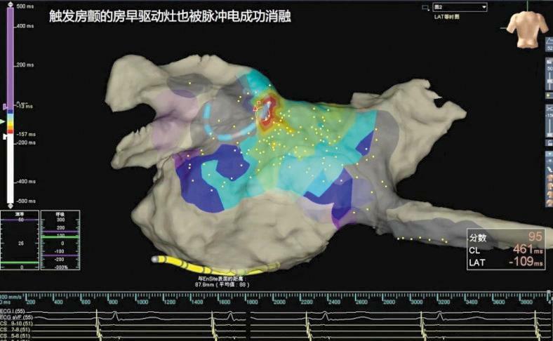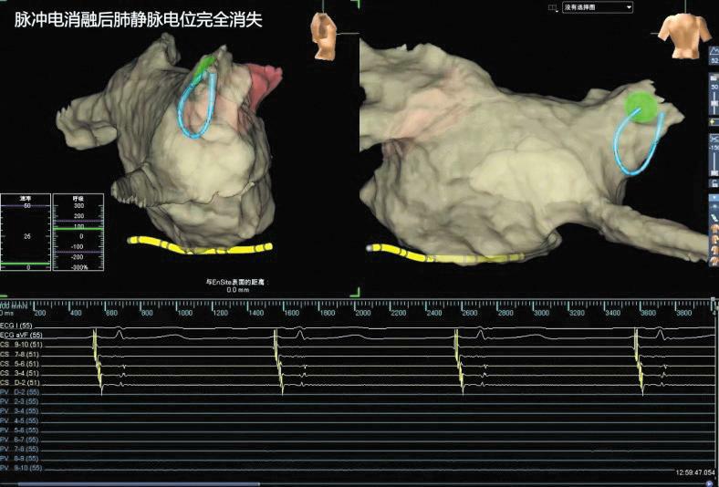 此时,标测电极在左上肺静脉房侧后壁位置仍可标测到房早,且可诱发出短阵房颤,确定靶点后,再次使用脉冲电消融导管对靶点进行局部精确放电消融2秒钟,房早不再出现,房颤亦不能被诱发,此项技术属于全国首例。