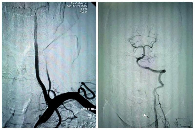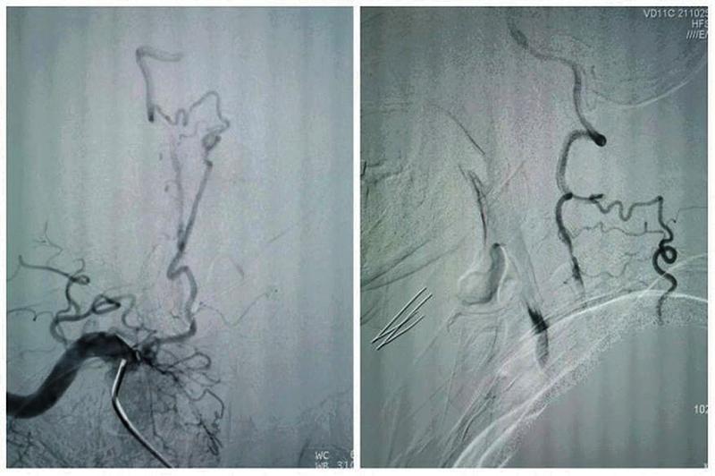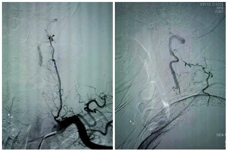 患者拜某,男,65岁,因反复头晕、晕厥1年,加重10天入院,既往5年前因心肌梗死在外院冠脉植入5枚支架。本次发病后当地医院发现患者脑后部的主干动脉——双侧椎动脉在颈部完全闭塞,当地医院药物医治无效,患者慕名从商洛来到我院神经内科。入院后经过脑血管造影发现患者双侧椎动脉颈部闭塞段大约10cm,闭塞远端经过甲状颈干及肋颈干向V2近颅底以远代偿供血,但因代偿不足,患者近来反复脑梗死2次,此次入院再次提示小脑新鲜脑梗死。