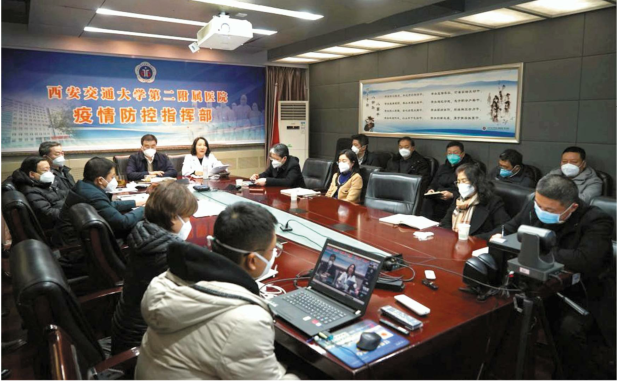 本报讯12月26日,李宗芳院长主持召开全院疫情防控视频例会,传达学习《国务院联防联控机制综合组关于进一步规范新冠病毒感染重症病例分类和报告的通知》、《陕西省医疗资源准备实施方案》等文件精神,进一步研究我院优化新冠肺炎救治工作措施。医院党委书记刘昌发表了重要讲话。院领导及联防联控领导小组成员在主会场参加,全院党政后勤、临床医技科室正副主任、支部书记及护士长在线上参会。