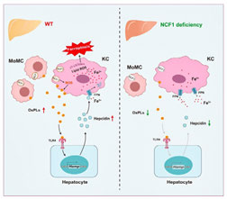 团队以肝巨噬细胞氧化还原调控及介导的免疫炎症在MASH中的关键作用为背景,揭示了巨噬细胞NCF1(NADPH氧化酶复合物组分)通过诱导固有的Kupffer细胞(KC)铁沉积及铁死亡,并促进炎症性单核细胞来源的巨噬细胞的浸润,加重MASH疾病进展;进一步通过体内、外实验阐明NCF1通过介导KC中氧化磷脂的生成促进肝细胞TLR4依赖性铁调素的产生,进而诱导KC铁沉积。基于MASH患者数据以及NCF1人源化突变小鼠,也进一步证实了人类MASH中KC的铁死亡,以及人NCF1R90H多态性与KC铁死亡之间的关联。该研究将拓展对MASH疾病中肝巨噬细胞异质性的认识,并为MASH的治疗提供重要的分子靶点。此项研究获得了国家自然科学基金、陕西省国际合作重点项目等资助。